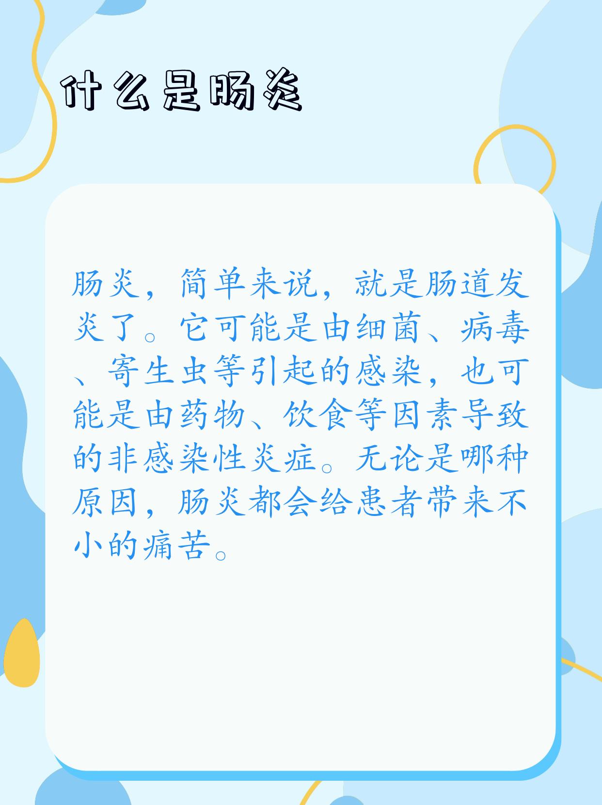 🌟肠炎,简单来说,就是肠道发炎了。它可能是由细菌、病毒、寄生虫等引起的感染,也可能是由药物、饮食等因素导致的非感染性炎症🙅♂️。无论是哪种原因,肠炎都会给患者带来不小的痛苦😵。