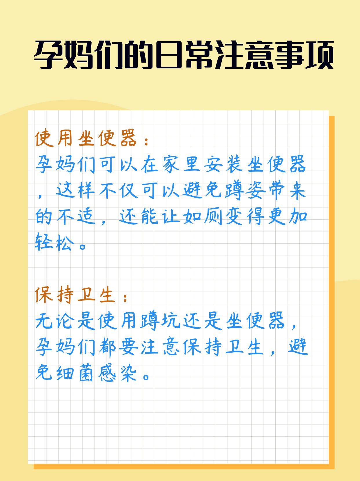 我告诉她,其实除了避免使用蹲坑外,孕妈们在日常生活中还有很多小细节需要注意:包括使用坐便器、保持卫生、调整饮食以及适当运动等。