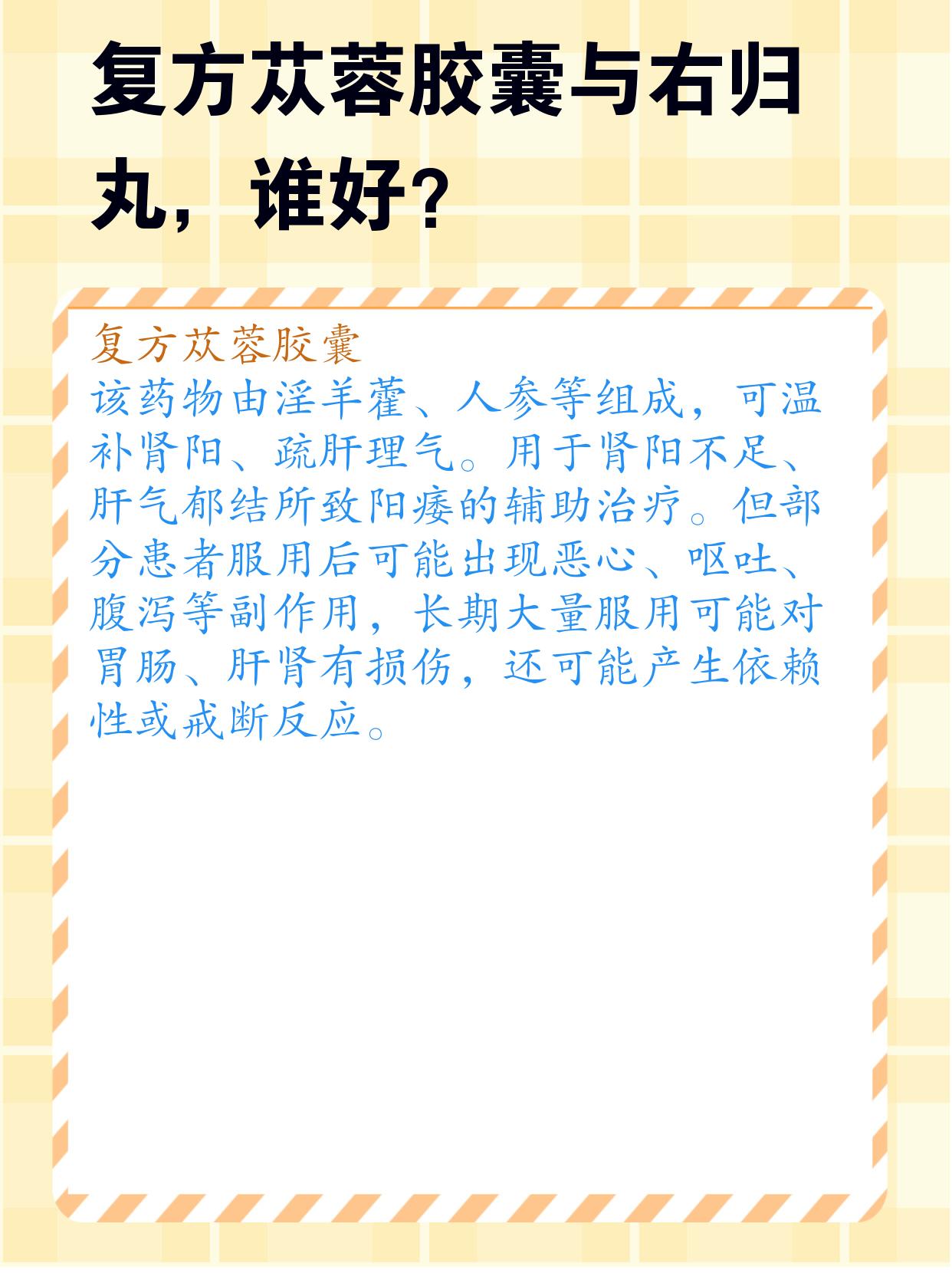 👨⚕️记得有一次,一个中年患者来到我这里,他因为长期劳累,导致肾阳不足,腰膝酸软,精神萎靡。他问:“听说复方苁蓉胶囊和右归丸都是用来补肾壮阳,哪个效果更好?”