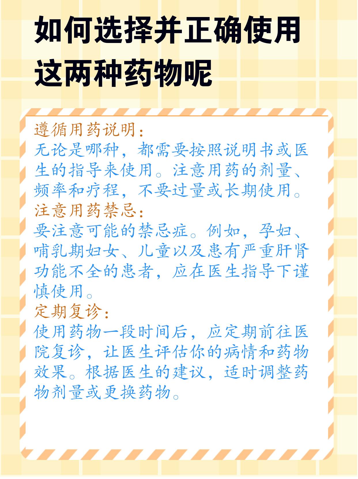 📌那么,如何选择并正确使用这两种药物呢?给大家一些建议:了解自身症状、咨询专业医生、 遵循用药说明、意用药禁忌、定期复诊等。