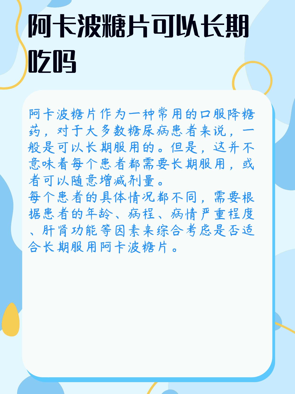 💡 阿卡波糖片作为一种常用的口服降糖药,对于大多数糖尿病患者来说,是可以长期服用的。但是,这并不意味着每个患者都需要长期服用,或者可以随意增减剂量。
