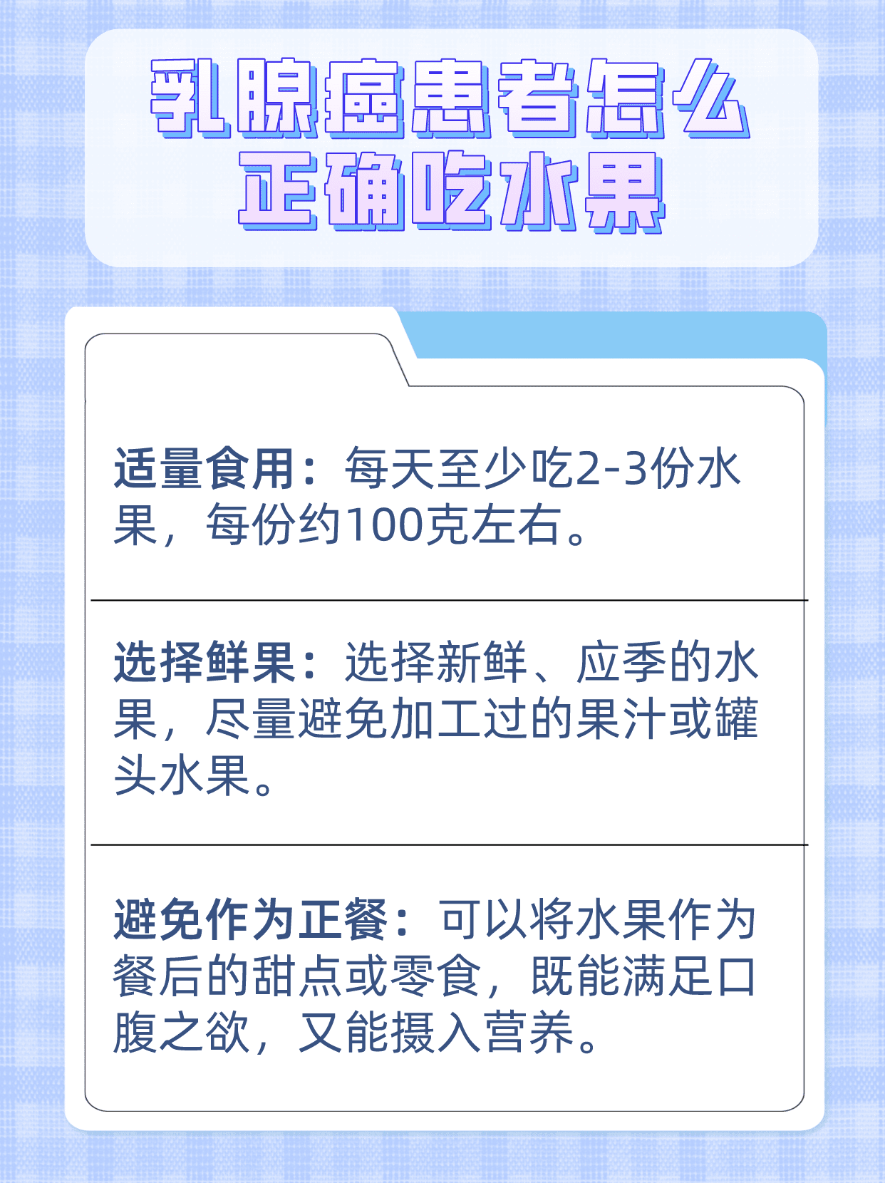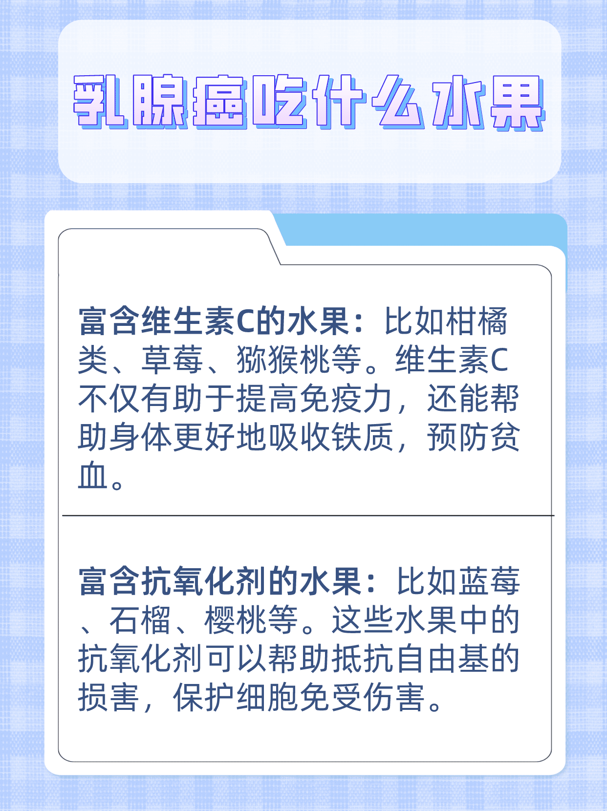 🍇 乳腺癌患者可以适当多吃1️⃣ 富含维生素C的水果、2️⃣ 富含抗氧化剂的水果、3️⃣ 富含膳食纤维的水果。