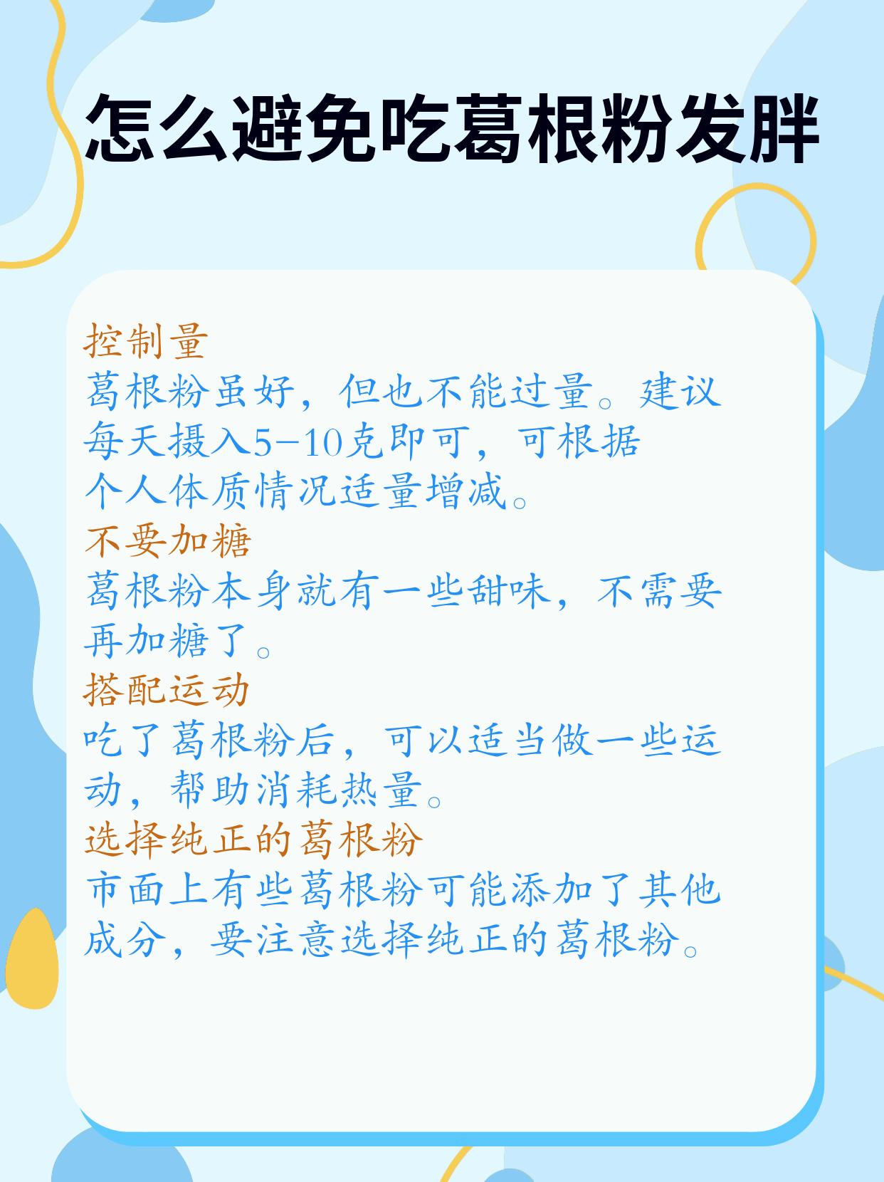 🎯如果你想吃葛根粉又不想发胖,要注意控制量、不要加糖、搭配运动、选择纯正的葛根粉等事项。