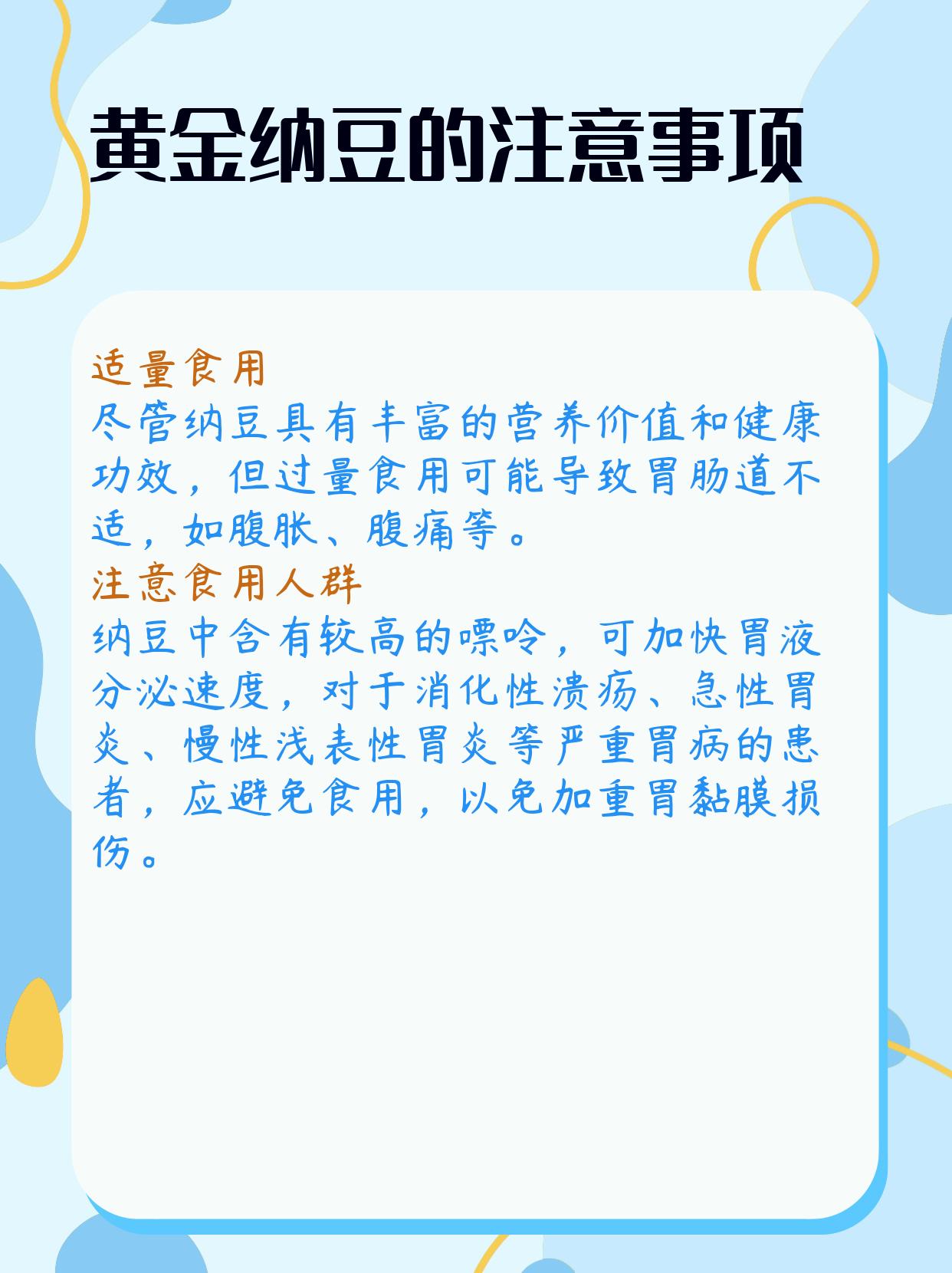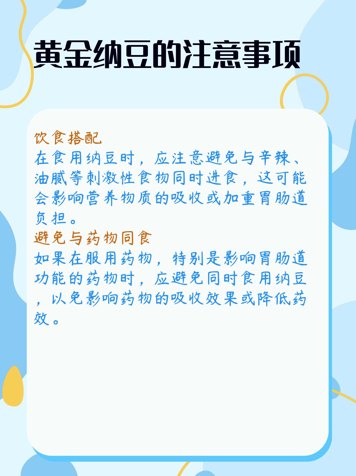 🙋♀️不过大家在食用黄金纳豆时也要注意一些事项哦😉,要适量食用、注意食用人群、饮食搭配、避免与药物同食。