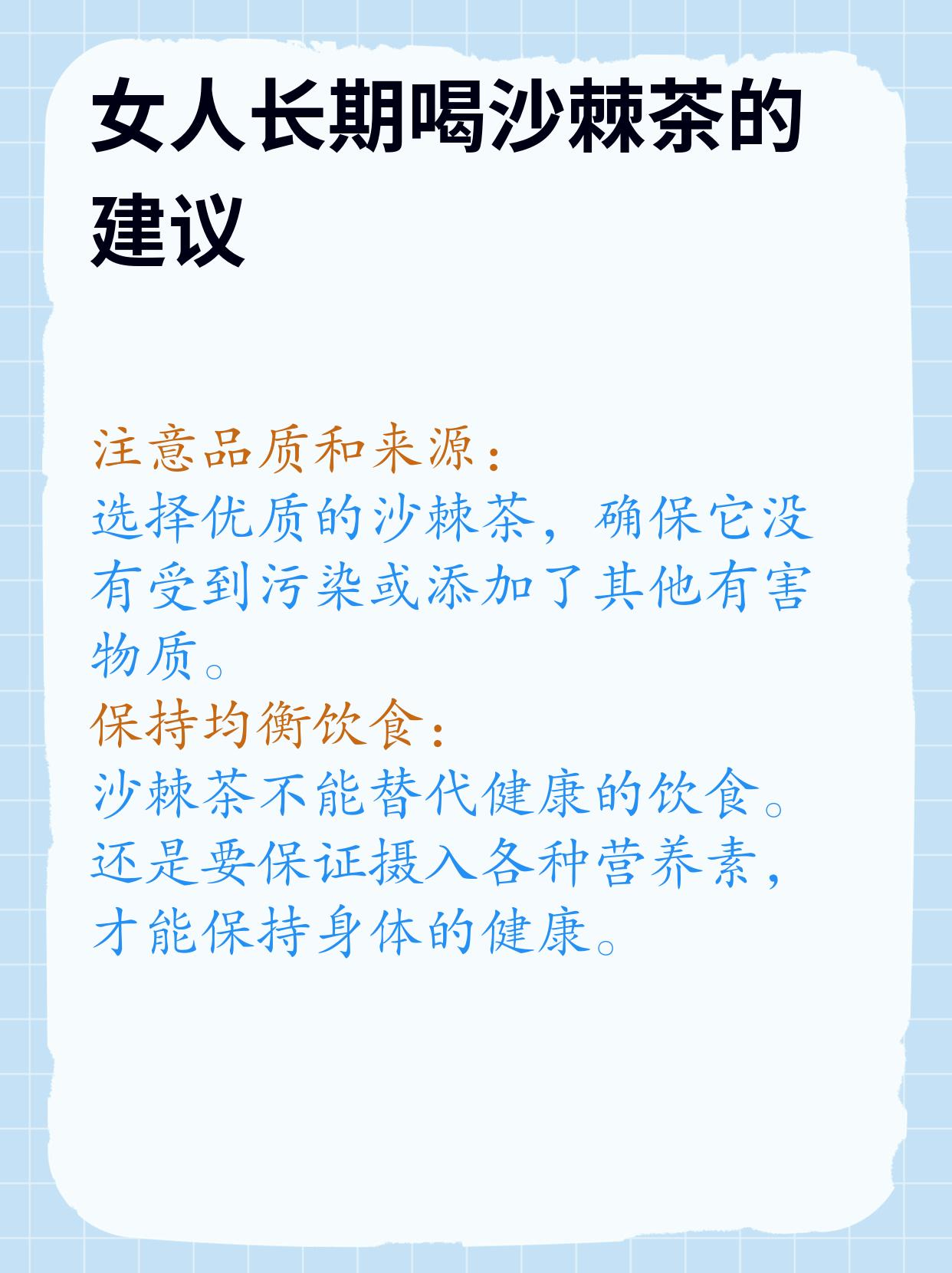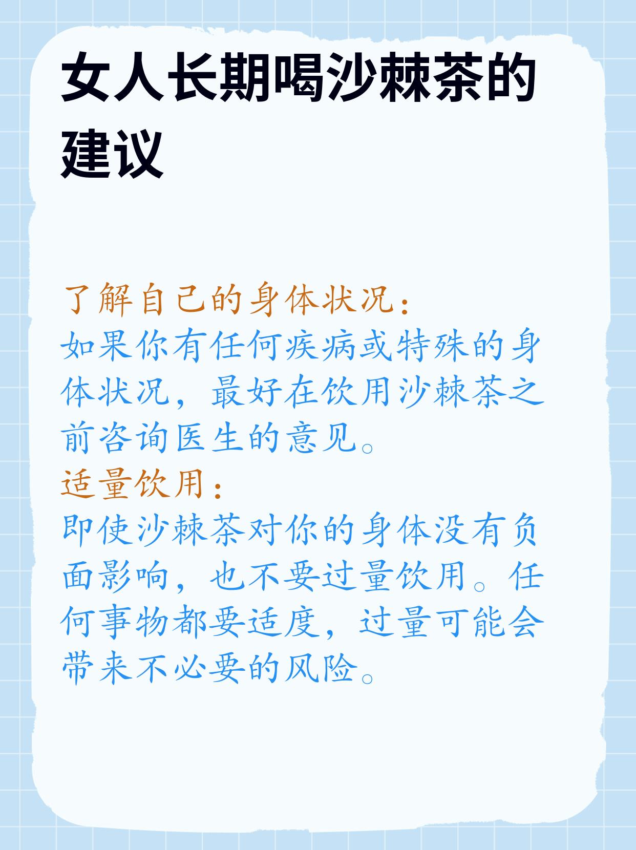 我告诉她,沙棘茶是一种营养丰富的茶饮,含有多种维生素、矿物质和抗氧化物质。适量饮用沙棘茶可能对身体有一定的益处。🤗但是,长期喝沙棘茶好不好,还需要根据个人的身体状况和饮食习惯来判断。😎