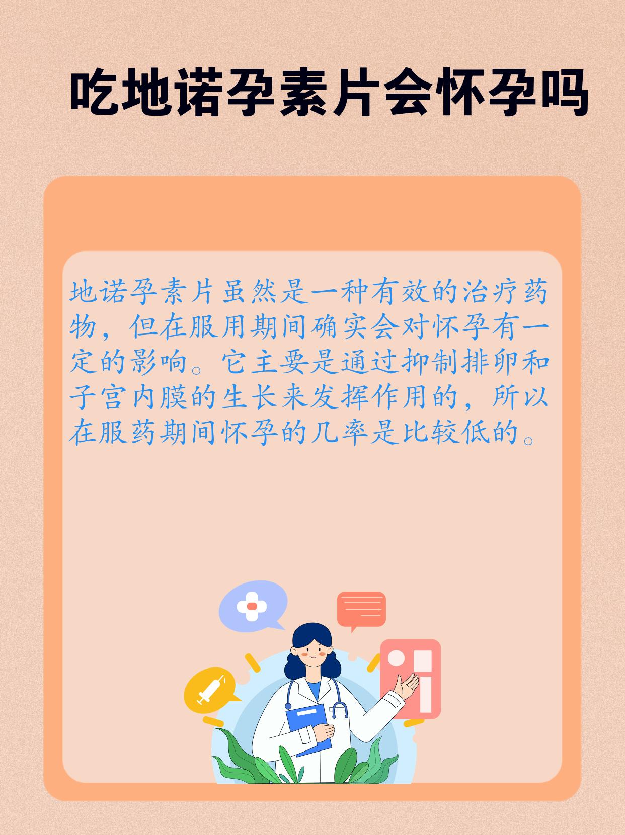 我给她做了详细的检查和评估😎,并告诉她,吃地诺孕素片期间怀孕的几率是比较低的😟。这是因为地诺孕素片主要通过抑制排卵和子宫内膜的生长来发挥作用😓,从而达到治疗疾病的目的😎。