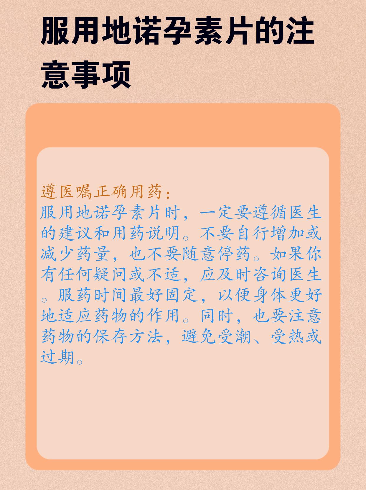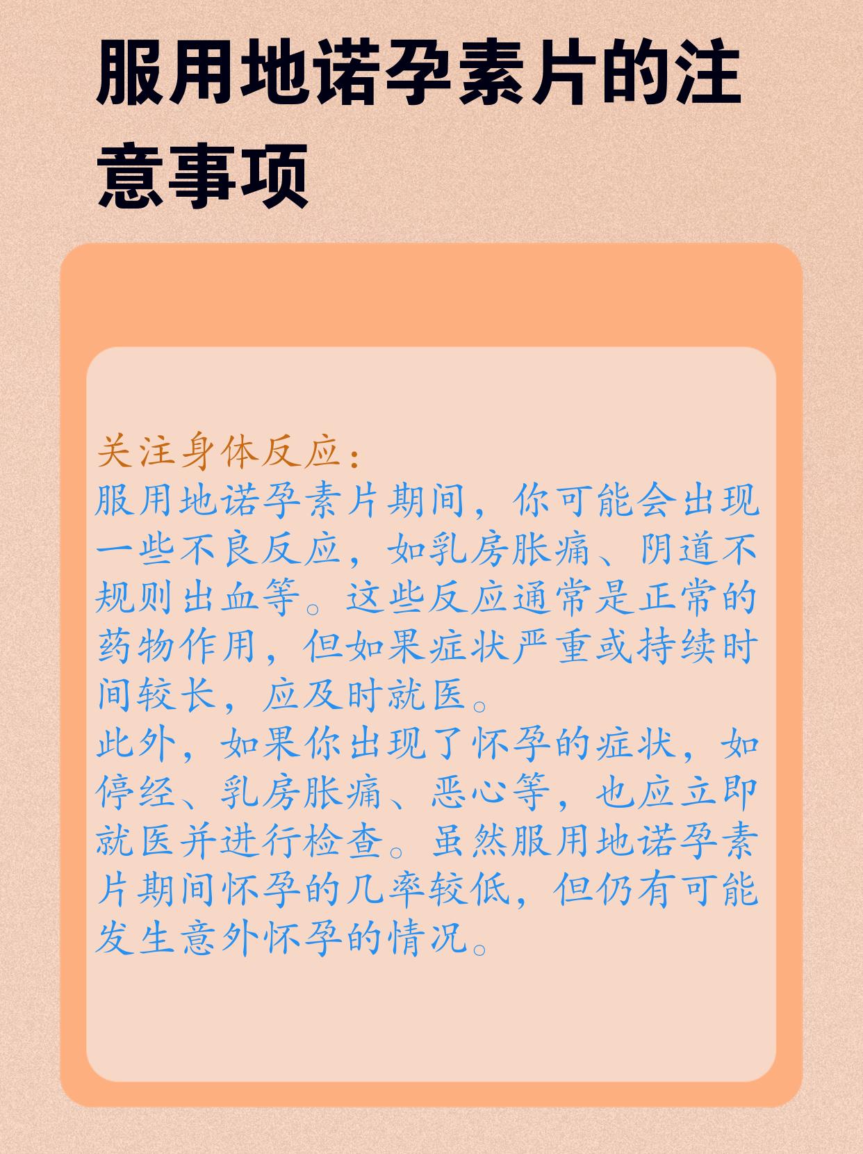 🌟那么,在服用地诺孕素片时,有哪些注意事项呢🧐?一定要在医生的指导下服用😓。也要关注身体反应,有不适要及时就医🚑。